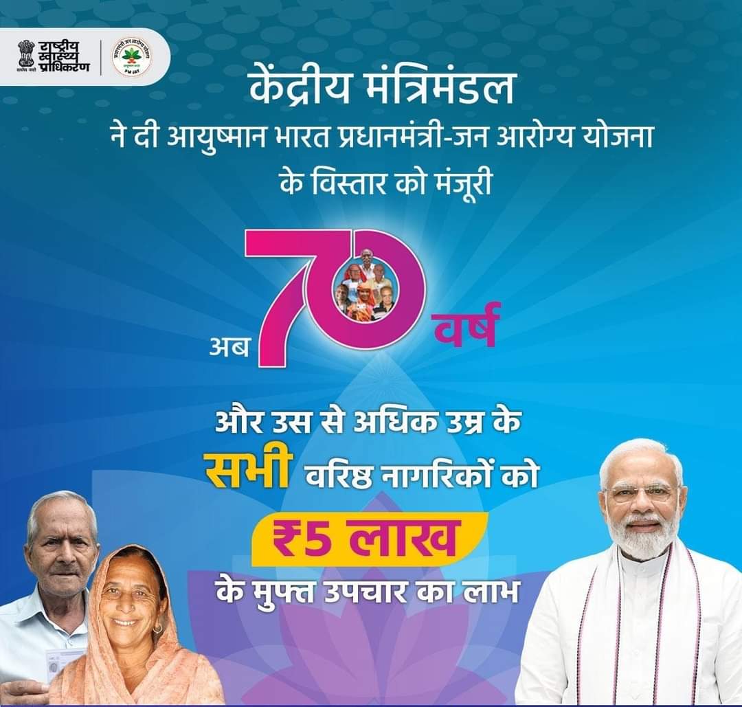 अब 70 वर्ष और उस से अधिक उम्र के सभी वरिष्ठ नागरिकों को मिलेगा 5 लाख के मुफ्त उपचार का लाभ।
