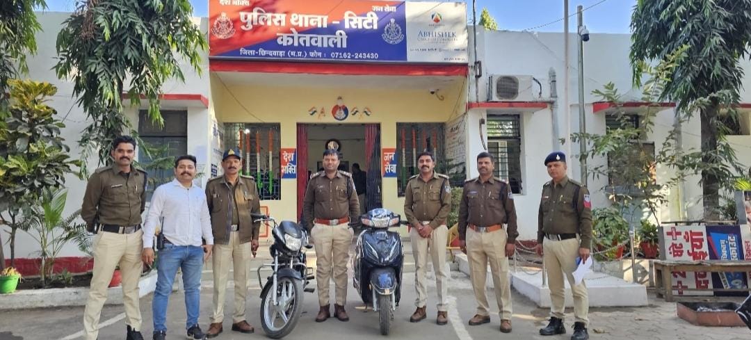 छिंदवाड़ा। कोतवाली पुलिस ने मंगलवार को बाइक चोरी को दो आरोपियों को गिराफ्तार किया है। दोनों आरोपियों से एक स्कूटी और एक बाइक जब्त की है। जिसकी बाजर में 1 लाख 65 हजार रूपए कीमत बताई गई है। आरोपियों से मशरूका जब्त कर लिया है। दोनों को न्यायालय में पेश कर जेल भेज दिया है। बता दें कि 12 दिसम्बर को प्रार्थी कैलाश पिता बल्ली उईके उम्र 28 साल निवासी ग्राम बाम्ला थाना लावाघोघरी हाल शिव नगर कालोनी में रह रहा है। उसने शिकायत दर्ज कराई कि 7 दिसम्बर की सुबह करीबन 8 बजे मोटर सायकल उसके घर के सामने रोड में खड़ी करके मजदूरी करने गया था। रात करीबन 9.45 बजे आकर देखा तो उसकी मोटर सायकल एचएफ डीलक्स मोटर सायकल एमपी 28-5एन 8563 नहीं मिली। जिसे आसपास तलाश की, जो नही मिली। जिसे कोई अज्ञात व्यक्ति चोरी कर ले गया। शिकायत पर धारा 303(3) बीएनएस के तहत मामला दर्ज कर जांच में लिया।