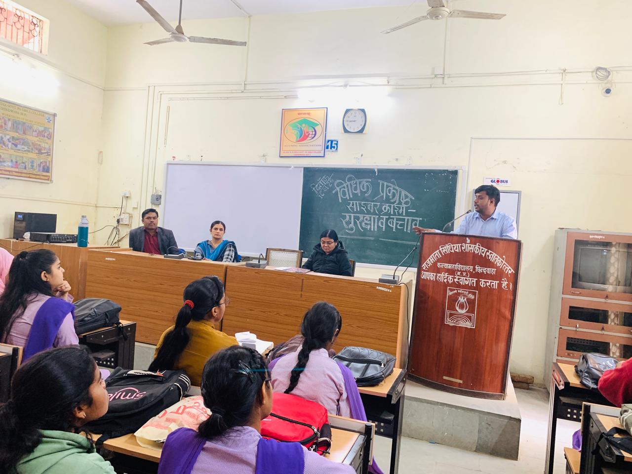 कार्यक्रम का संचालन विधिक प्रकोष्ठ प्रभारी डॉ . संधु लाहोरिया ने एवं आभार प्रदर्शन डॉ. जितेंद्र डेहरिया ने किया ।कार्यक्रम में विधिक प्रकोष्ठ की सदस्य पूनम उसरेठे, डॉ रजीना खान एवं बड़ी संख्या में महाविद्यालय की छात्राएँ उपस्थित हुई।