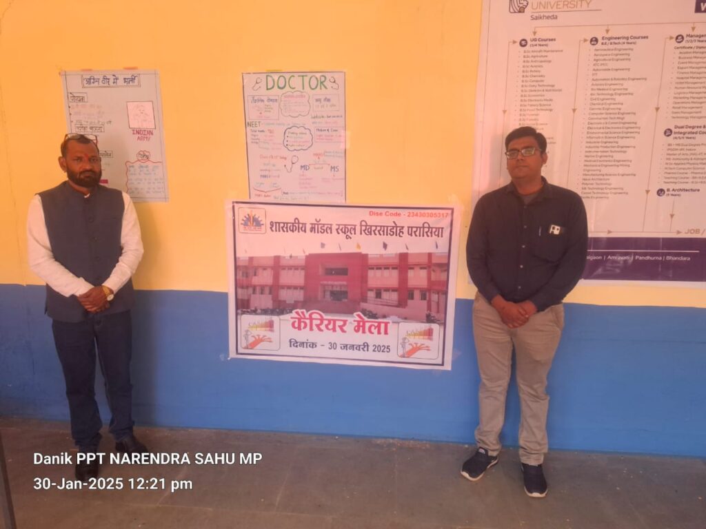 छिंदवाड़ा: शासकीय उच्चतर माध्यमिक विद्यालय खिरसाडोह में कॅरियर काउंसलिंग एवं मार्गदर्शन हेतु कॅरियर मेला का आयोजन किया गया। शा. पालिटेक्निक महाविद्यालय खिरसाडोह के श्री दीपक भावसार होड़ गणित, श्री प्रमोद कुमार शाक्य ट्रेनिंग एवं प्लेसमेंट ऑफिसर, एवं सुश्री निधि नाग लेक्चरर ने कक्षा 10वीं की परीक्षा में शामिल हो रहे विधार्थियों को रुचि एवं क्षमता के अनुसार कक्षा 11वीं में विषय आर्ट्स, कॉमर्स एवं साइंस चयन से संबंधित कॅरियर की जानकारी दी एवं विषय चयन से संबंधित मार्गदर्शन प्रदान किया गया।