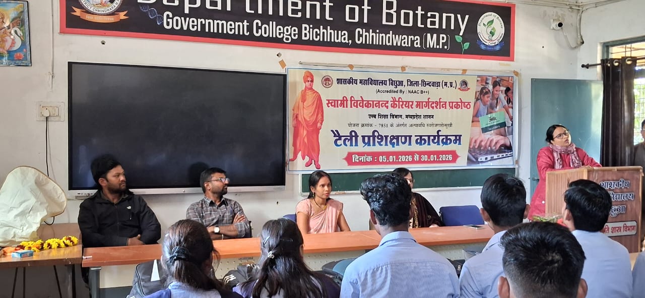 छिन्दवाड़ा: /06 जनवरी 2026/ वीर अमर शहीद स्वर्गीय श्री कबीर दास उईके शासकीय महाविद्यालय बिछुआ में उच्च शिक्षा विभाग की योजना क्रमांक-7581 के अंतर्गत स्वामी विवेकानंद कैरियर मार्गदर्शन प्रकोष्ठ एवं इनोवेशन एंड इन्कुबेशन सेंटर के संयुक्त तत्वावधान में 25 दिवसीय टैली प्रशिक्षण का शुभारम्भ 5 जनवरी 2026 को प्राचार्य डॉ.आर.पी यादव के कुशल मार्गदर्शन में एवं कार्यक्रम की अध्यक्ष डॉ.पूजा तिवारी की गरिमामयी उपस्थिति में हुआ। यह प्रशिक्षण 5 जनवरी से 29 जनवरी 2026 तक चलेगा, जिसमें लगभग 60 विद्यार्थियों ने पंजीयन कराया है। प्रशिक्षण जीत कंप्यूटर एजुकेशन बिछुआ से श्रीमती पूनम कड़वे द्वारा दिया जा रहा