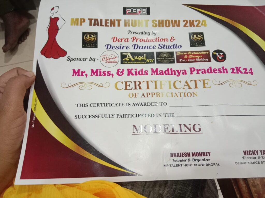 अनाया परमार श्रीमती अंकिता परमार की बेटी है एवं आशुतोष सिंह परमार ,अभिषेक परमार ,मोहित परमार की भांजी है उक्त कार्यक्रम में नैना पन्नाम मिस एमपी 24 ,,निधि सोलंकी पूर्व मिस एमपी एवं कुमकुम एलाने के हस्ते अनाया परमार को सम्मानित किया गया इस कार्यक्रम के मार्गदर्शक विक्की यादव एवं संचालक बृजेश महोवे रहे। अन्य परमार उक्त प्रतियोगिता में अनाया परमार अब नेशनल इंडिया किड्स के लिए नामांकित हुई है इस उपलब्धि पर नगर वासियों ने बधाई देते हुए बिटिया के उज्जवल भविष्य की कामना की है।