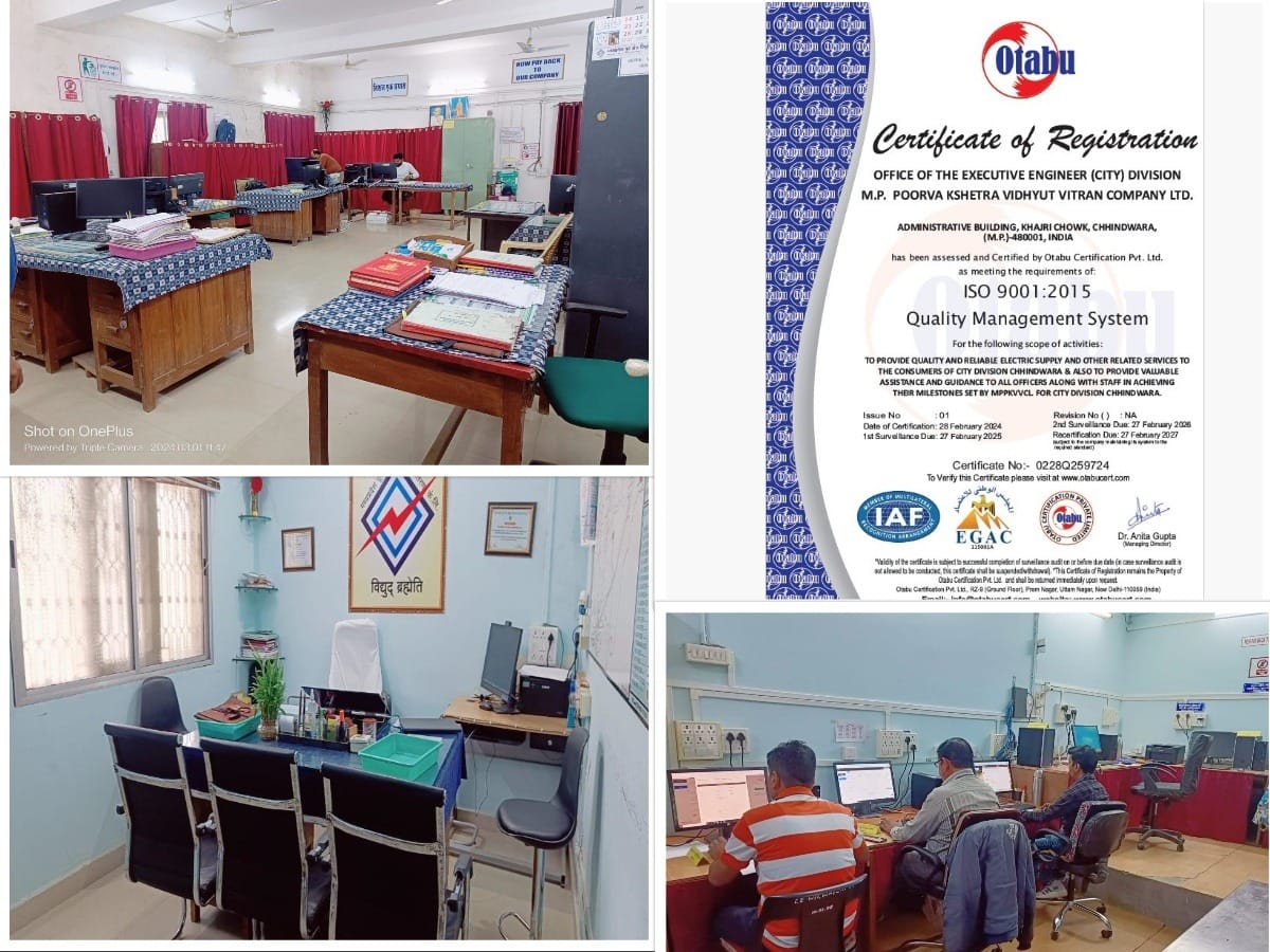 इसके अंतर्गत संचा. वृत्त छिन्दवाडा के अन्तर्गत संचा.-संधा. वृत्त कार्यालय छिन्दवाडा, संभागीय कार्यालय शहर संभाग-छिन्दवाडा, पूर्व संभाग-छिन्दवाडा, संभागीय कार्यालय पांढुर्णा, चौरई, परासिया, जुन्नारदेव, सौंसर, तथा वितरण केन्द्र कार्यालय कुंडालीकला, लोधीखेडा एवं उमरेठ कार्यालय को आई.एस.ओ. 9001:2015 प्रमाण-पत्र प्राप्त हुआ है एवं वृत्तान्तर्गत शेष कार्यालय के लिये आई.एस.ओ. 9001:2015 प्रमाण-पत्र प्राप्त करने के लिये प्राथमिकता के आधार पर कार्यवाही की जा रही है।