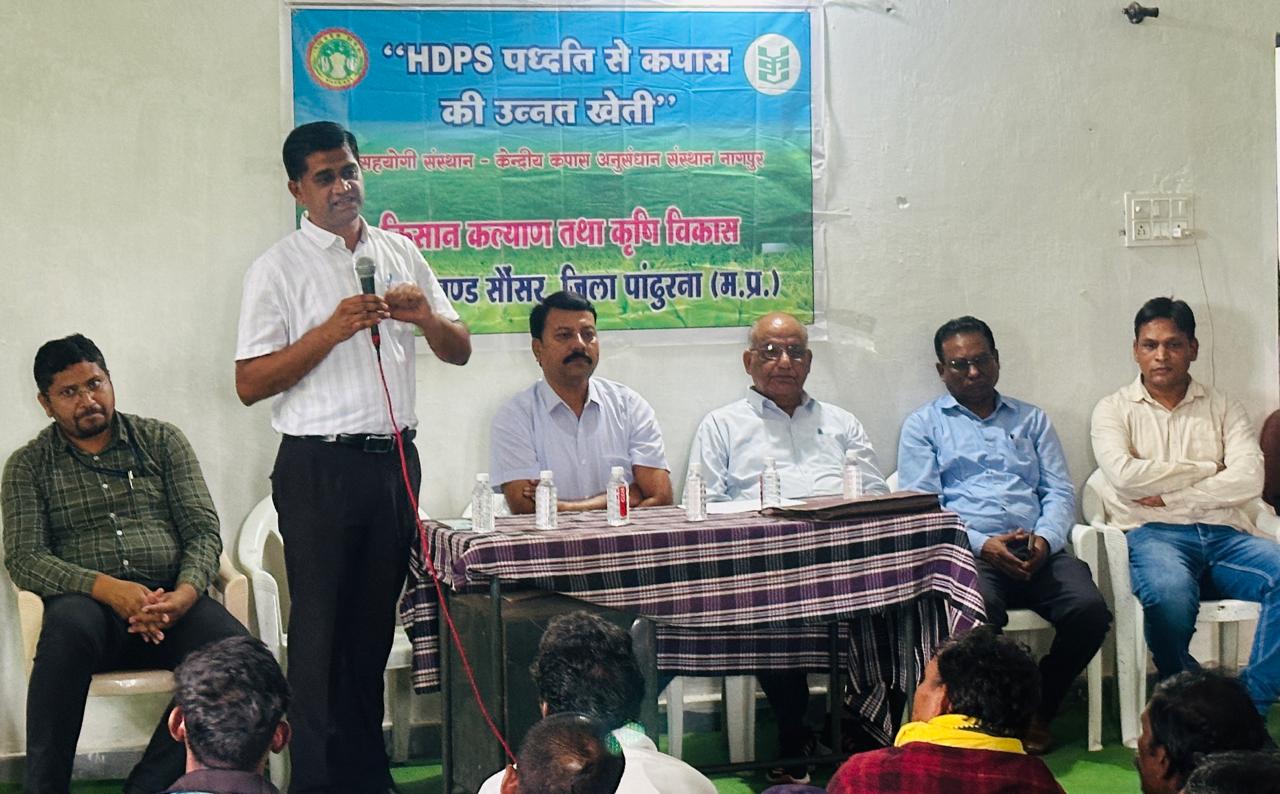 सघन रोपण प्राणाली (एच.डी.पी.एस.) पद्धति से कपास की खेती करने वाले किसानों को उचित केनॉपी मेनेजमेंट के बारे विस्तारपूर्वक जानकारी प्रदान की गई जिसमें फसल की 45 दिन की अवस्था में कम से कम पौधे 1.5 से 2.0 फीट एवं पाति निर्माण अवस्था पर ग्रोथरेगुलेटिंग हार्मोंस चमत्कार 12 मि.ली. प्रति 15 लीटर पानी की दर से घोल बनाकर एक एकड में 10 टंकी दवा का छिडकाव करने की सलाह दी गई, जिससे की पौधे की बढवार नियंत्रित करते हुये प्रति एकड क्षेत्रफल से अच्छा उत्पादन प्राप्त किया जा सके। सभी चयनित कृषकों को केन्द्रीय कपास अनुसंधान संस्थान नागपुर द्वारा उन्नत किस्म का बीज एवं ग्रोथरेगुलेटिंग हार्मोंस नि3शुल्क प्रदान किया गया। केन्द्रीय कपास अनुसंधान संस्थान नागपुर डॉ.दीपक नागराले द्वारा कपास फसल में रोग एवं कीट प्रबंधन के संबंध में तकनीकी जानकारी प्रदान की गई वरिष्ठ वैज्ञानिक एवं डीन जेड.ए. आर.एस. डॉ.आर.सी. शर्मा ने कपास फसल में पोषक तत्व प्रबंधन के बारे में जानकारी दी । कृषि विज्ञान केन्द्र के प्रमुख डॉ.डी.सी. श्रीवास्तव के द्वारा कपास फसल नवाचार को बढावा देने पर जोर दिया गया जिससे की अच्छा उत्पादन प्राप्त हो सके। उप संचालक कृषि श्री सिंह द्वारा एच.डी.पी.एस. पध्दति से कपास की खेती के लिये जिले में हल्की जमीन में कपास उत्पादक किसानों के लिये वरदान साबित होना बताया गया जिससे किसानों को पूर्व में हो रहे उत्पादन की तुलना में दोगुना अधिक उत्पादन होने की बात कही गई। इस कार्यक्रम में अनुविभागीय कृषि अधिकारी सौंसर, वरिष्ठ कृषि विकास अधिकारी, कृषि विस्तार अधिकारी, बी.टी.एम, ए.टी.एम. आत्मा, डब्ल्यू. डब्ल्यू.एफ. के सुश्री प्रतिक्षा मेहरा एवं सृजन के अधिकारी उपस्थित थे।