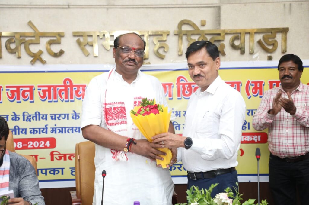 छिन्दवाड़ा: / 23 अगस्त 2024/ केन्द्रीय राज्य मंत्री जनजातीय कार्य मंत्रालय भारत सरकार श्री दुर्गादास उईके ने आज जिले का दौरा किया । केन्द्रीय राज्य मंत्री श्री उईके के जिले में आगमन पर सर्किट हाउस में सांसद श्री विवेक बंटी साहू, कलेक्टर श्री शीलेन्द्र सिंह, एसपी श्री मनीष खत्री, जिला आपदा प्रबंधन समिति के सदस्य श्री शेषराव यादव और अन्य जनप्रतिनिधियों प्रशासनिक अधिकारियों द्वारा उन्हें पुष्पहार और पुष्पगुच्छ भेंट कर उनका आत्मीय स्वागत किया गया।